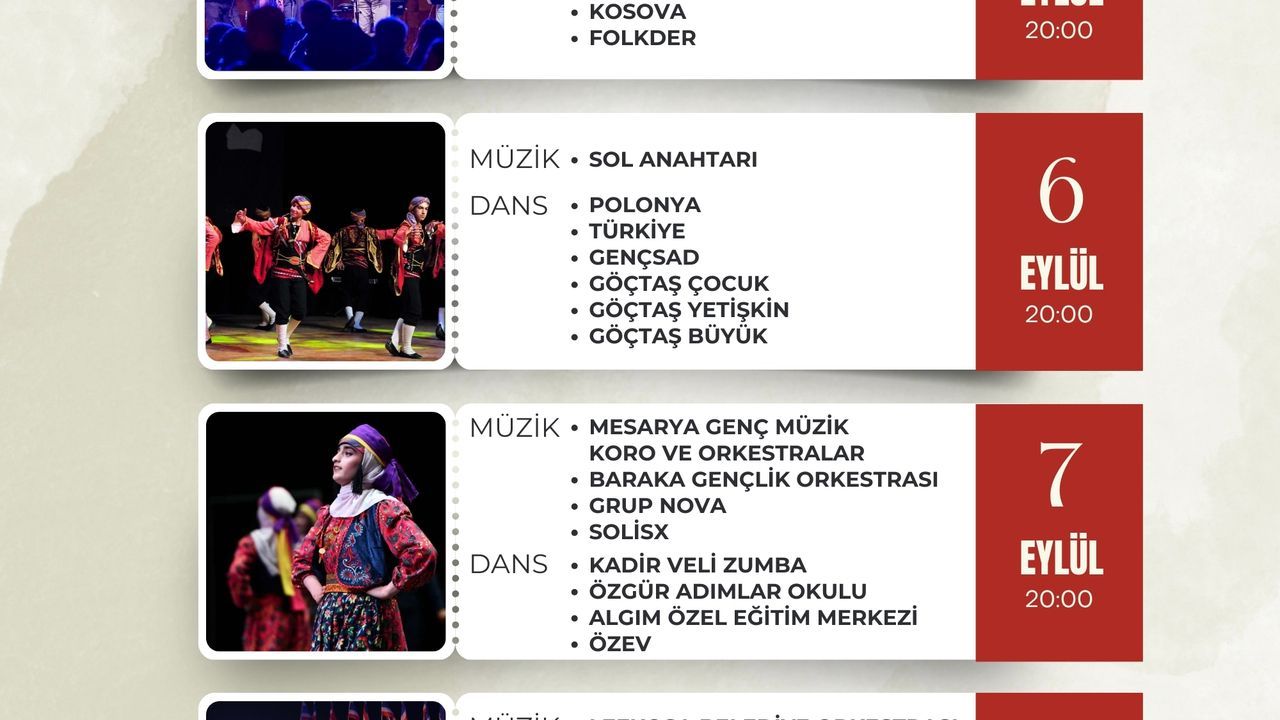 Festivalde, yurt içinden çeşitli halk dansları dernekleri, modern dans grupları ve orkestralar da sahne alacak. Festivalin 8 Eylül Pazartesi gecesi gerçekleşecek kapanış gecesinde ise Lefkoşa Belediye Orkestrası konser verecek.