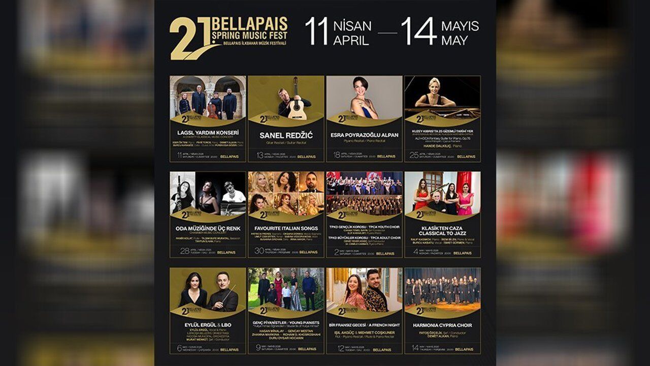 21. Uluslararası Bellapais İlkbahar Müzik Festivali programı kapsamında, 11 Nisan'da LAGSL Yardım Konseri, 13 Nisan'da Sanel Redzic Gitar Resitali, 18 Nisan'da Esra Poyrazoğlu Alpan Piyano Resitali, 25 Nisan'da Kuzey Kıbrıs'ta Gizemli 25 Tarihi Yer 'Ali Hoca Fantasy Suite for Piano, Op.76' Hande Dalkılıç Piano, 28 Nisan'da Oda Müziğinde Üç Renk, 30 Nisan'da Favourite Italian Songs, 2 Mayıs'da TPKD Gençlik Korosu Ve Büyükler Korosu, 4 Mayıs'ta Klasikten Caza, 6 Mayıs'ta Eylül Ergül & LBO, 9 Mayıs'ta Genç Piyanistler, 12 Mayıs'ta Bir Fransız Gecesi ve 14 Mayıs'ta Harmonia Cypria Choir konserleri yer alacak.
