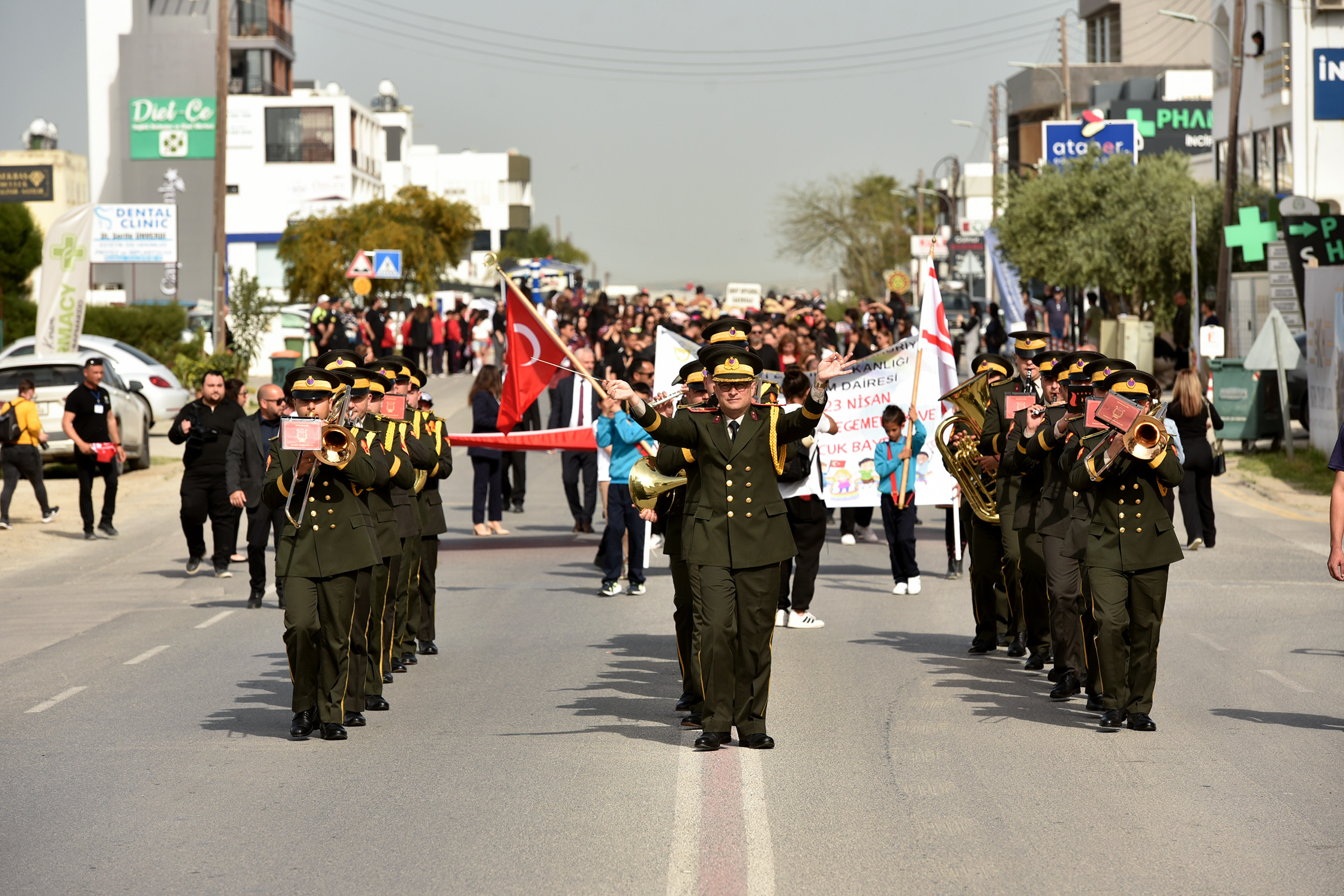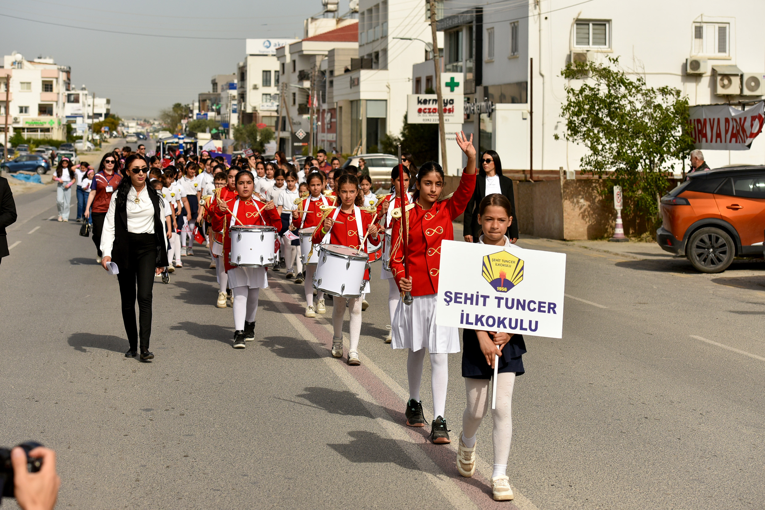 Güvenlik Kuvvetleri Komutanlığı Bandosu eşliğinde, Lefkoşa'daki ilkokul öğrencilerinin katılımıyla düzenlenen ve Metehan'dan başlayarak Cumhurbaşkanlığı ile Cumhuriyet Meclisi güzergâhında devam eden yürüyüşe, Milli Eğitim Bakanı Nazım Çavuşoğlu ile Bakanlık yetkilileri ve öğretmenler katıldı.