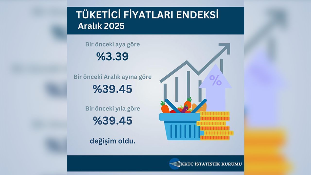 KKTC İstatistik Kurumu'nun Tüketici Fiyatları Genel Endeksi'nde, bir önceki aya göre yüzde 3,39, bir önceki yılın aralık ayına göre yüzde 39,45 ve bir önceki yılın aynı ayına göre yüzde 39,45 değişim yaşandı.
