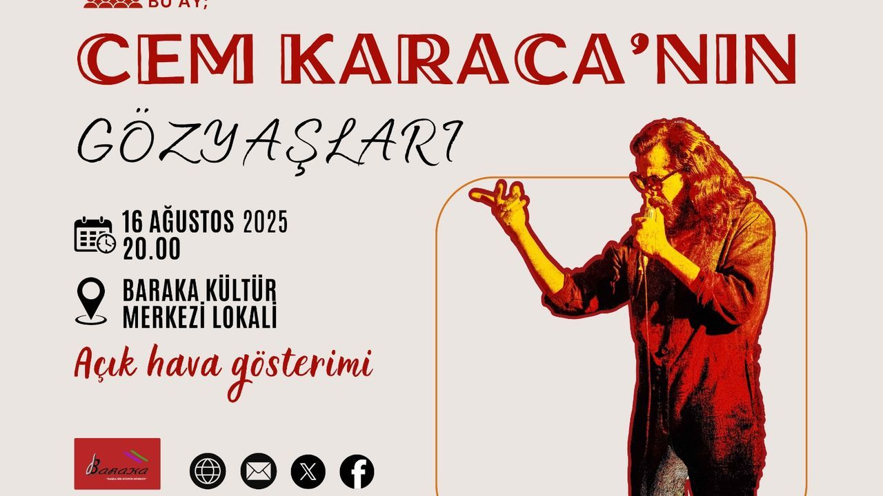 Baraka Kültür Merkezi, açık hava film gösterimlerinde 16 Ağustos Cumartesi akşamı “Cem Karaca’nın Gözyaşları” filmini gösteriyor.