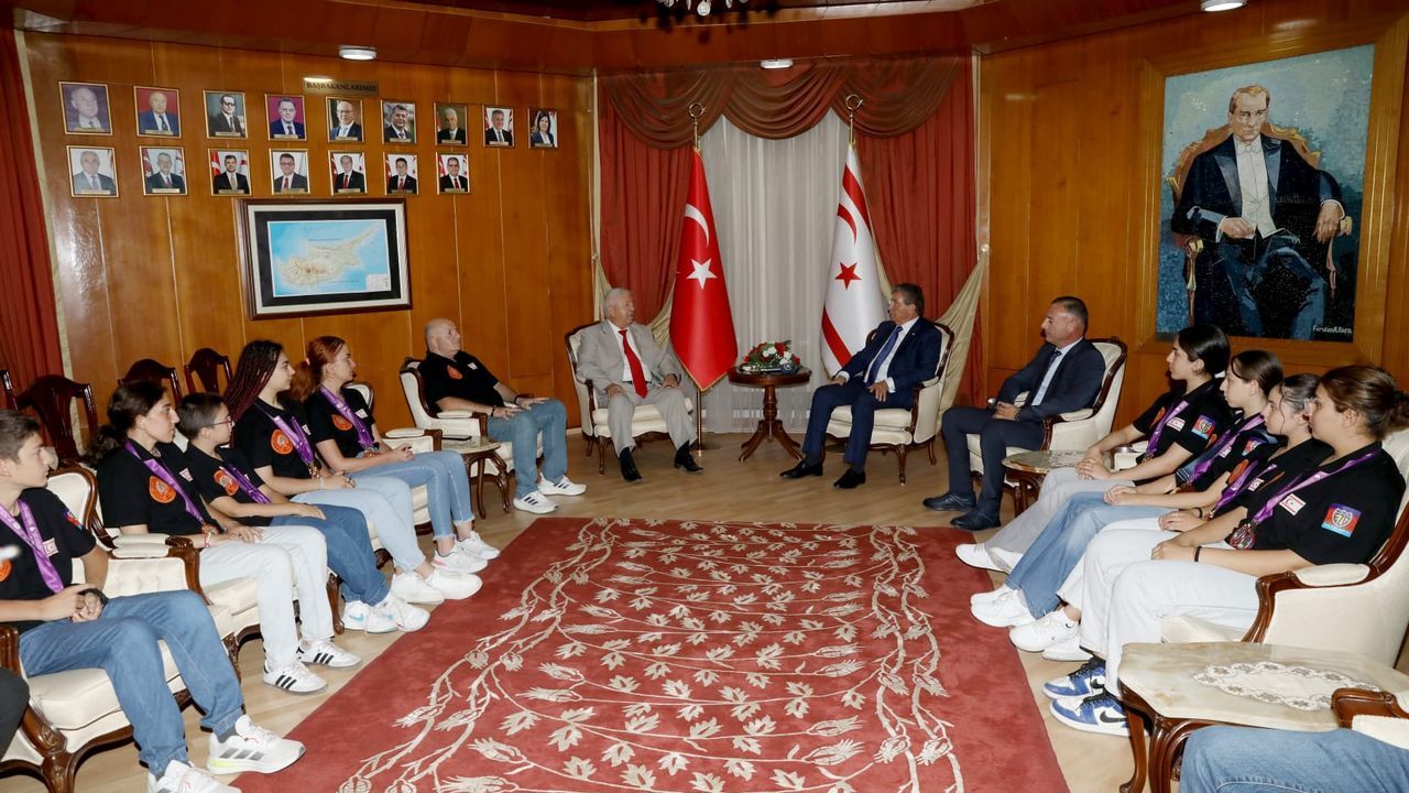 Başbakan Ünal Üstel, İskoçya’da düzenlenen GTF Dünya Şampiyonası’nda 41 madalya kazanarak genel klasmanda ikinci olan KKTC Tekvando Milli Takımı sporcularını kabul etti.