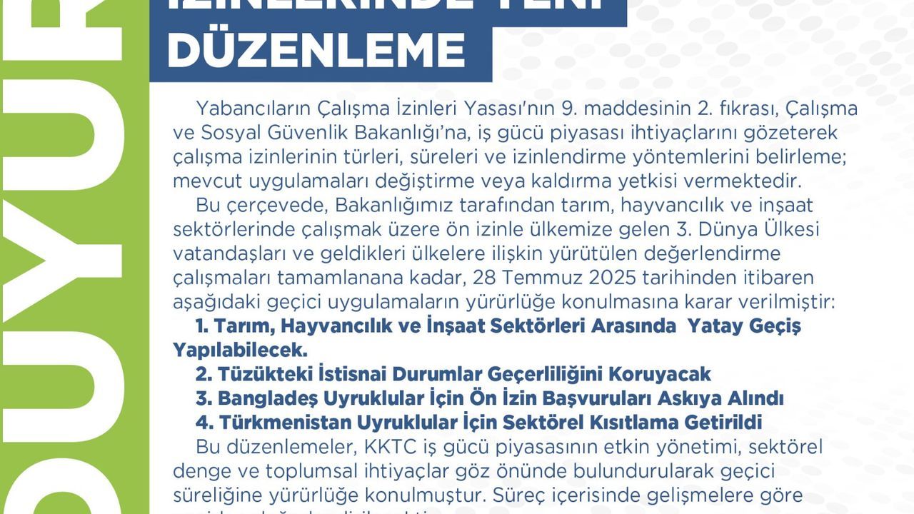 Açıklamada, bu düzenlemelerin, KKTC iş gücü piyasasının etkin yönetimi, sektörel denge ve toplumsal ihtiyaçlar göz önünde bulundurularak geçici süreliğine yürürlüğe konulduğu belirtilerek, süreç içerisinde gelişmelere göre yeniden değerlendirme yapılacağı kaydedildi.