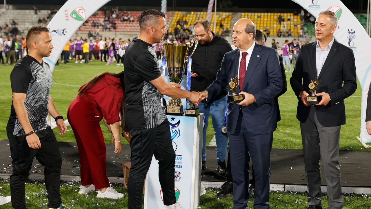Cumhurbaşkanı Tatar, Lefkoşa Atatürk Stadı’nda oynanan karşılaşmada rakibi Mağusa Türk Gücü’nü 3-1 mağlup ederek Daikin Kıbrıs Kupası’nda şampiyon olan Lefke Türk Spor Kulübü’ne, kupasını takdim etti.