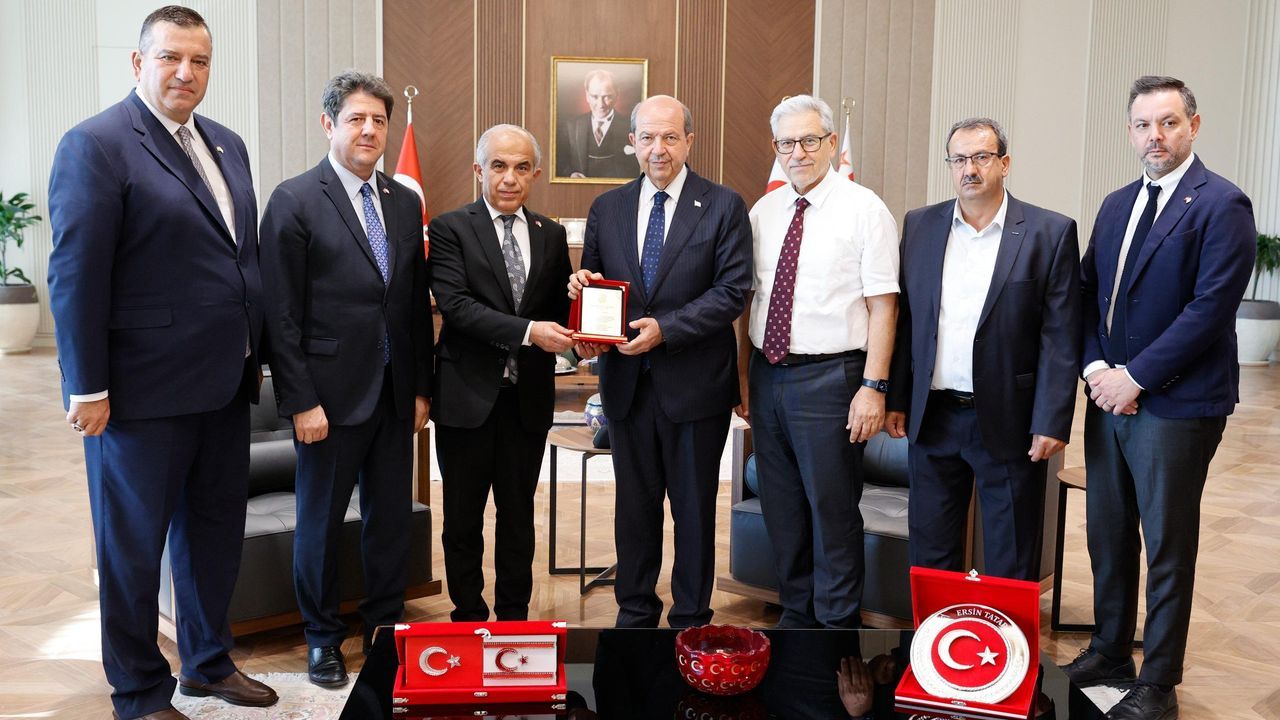 Cumhurbaşkanı Ersin Tatar, Akdeniz Narenciye İhracatçılar Birliği Başkanı Ahmet Hastürk, Kıbrıs Türk Narenciye İhracatçılar Birliği Başkanı Fethi Bardakçıoğlu, Ulusal Turunçgil Konseyi Başkanı Kemal Kaçmaz ve beraberindeki heyeti kabul etti.
