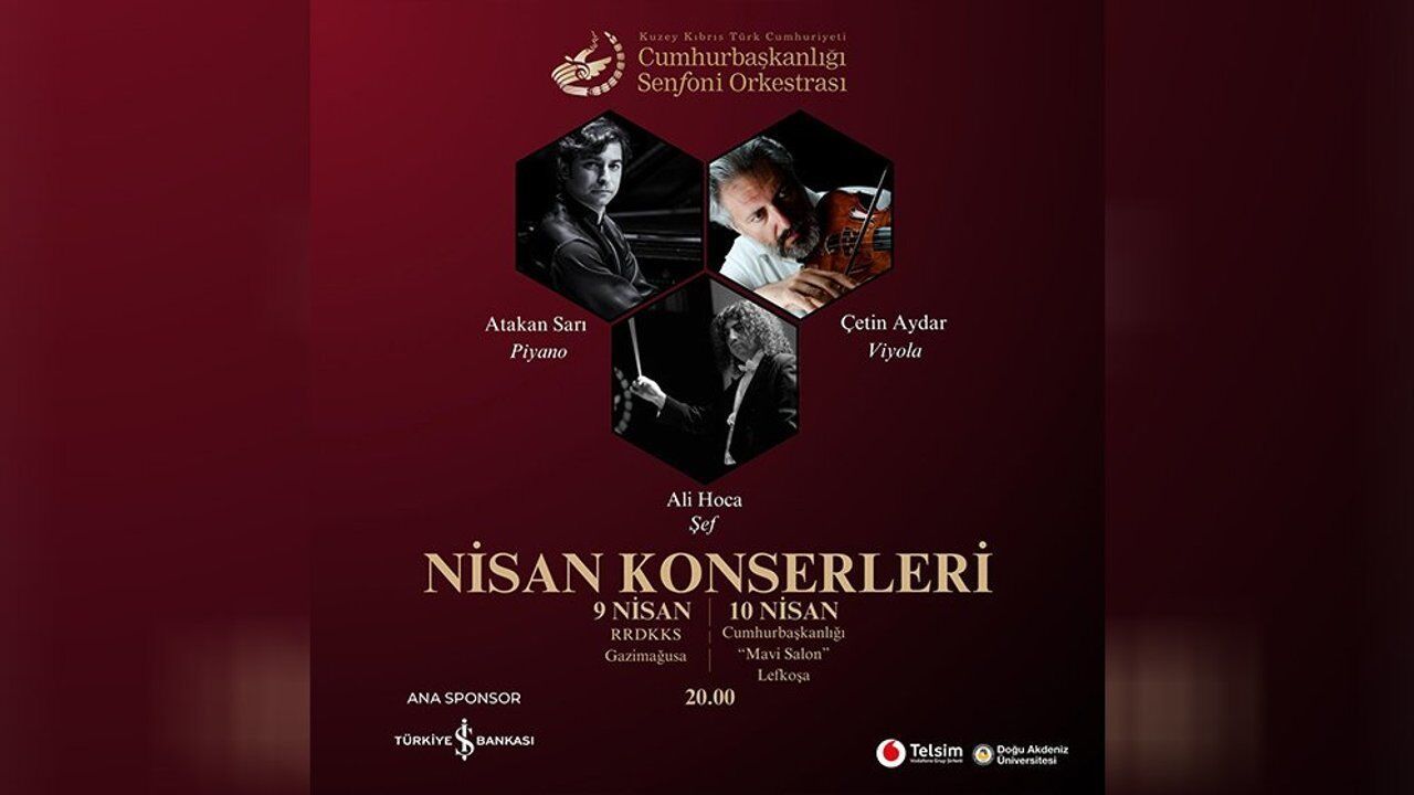 Cumhurbaşkanlığı'ndan verilen bilgiye göre, Şef Ali Hoca yönetiminde; viyolada Çetin Aydar ve piyanoda Atakan Sarı'nın solist olarak yer alacağı konserler, 9 Nisan Perşembe saat 20.00'de Gazimağusa Rauf Raif Denktaş Kültür ve Kongre Sarayı'nda ve 10 Nisan Cuma saat 20.00'de Cumhurbaşkanlığı Mavi Salon'da gerçekleştirilecek.