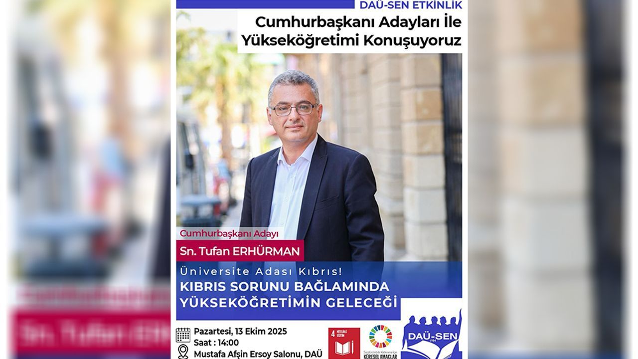Tufan Erhürman'ın katılacağı söyleşinin 13 Ekim Pazartesi günü saat 14.00'te DAÜ Mustafa Afşin Ersoy Salonu'nda yapılacağı duyurulan açıklamada, etkinliğe, tüm DAÜ personeli ve öğrencilerinin davetli olduğu belirtildi.