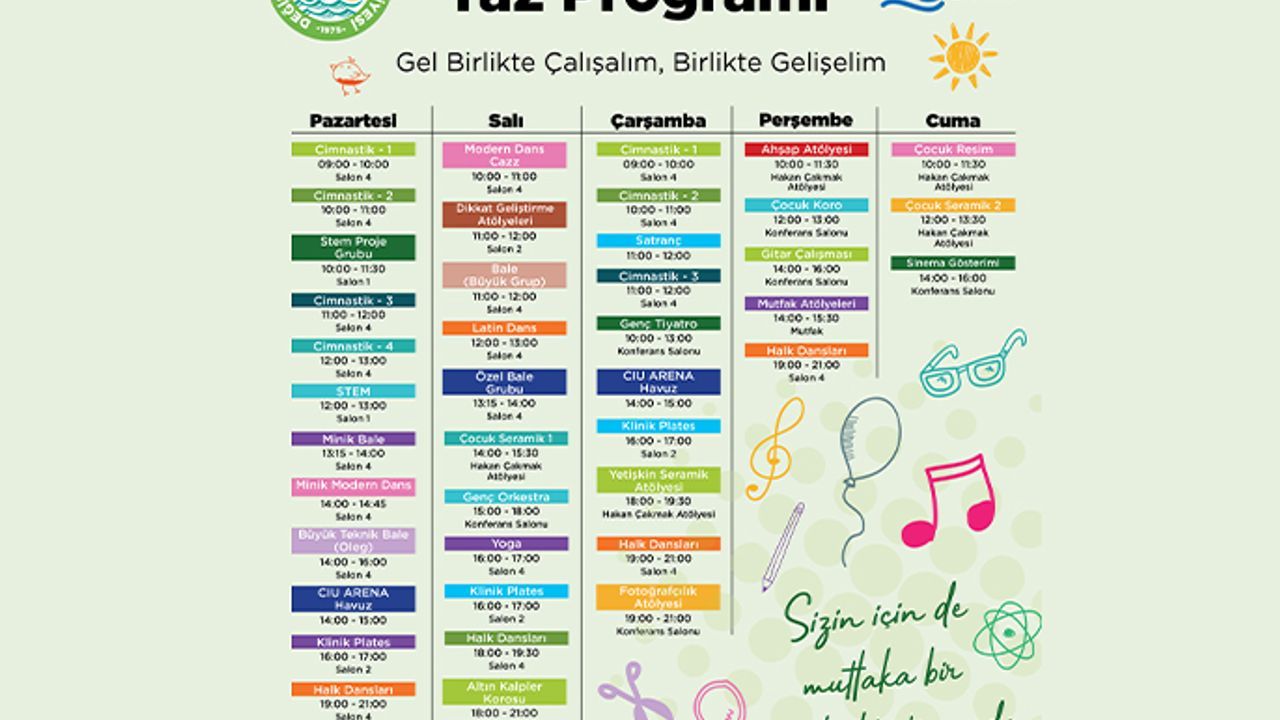 “Jimnastik; Fen, Teknoloji, Mühendislik ve Matematik (Science Teknology Engineer Matematic-STEM) Proje Grubu; Minik Modern Dans; Büyük Teknik Bale; Yüzme Kursu (CIU Arena-Havuz); Klinik Pilates; Halk Dansları; Okuma Yazma Kursu; Modern Dans (Cazz); Dikkat Geliştirme Atölyesi; Bale; Latin Dans, Seramik Atölyesi; Genç Orkestra; Yoga; Satranç; Genç Tiyatro; Fotoğrafçılık Atölyesi; Ahşap Atölyesi; Çocuk Koro; Gitar Çalışması; Mutfak Atölyesi; Resim Atölyesi”