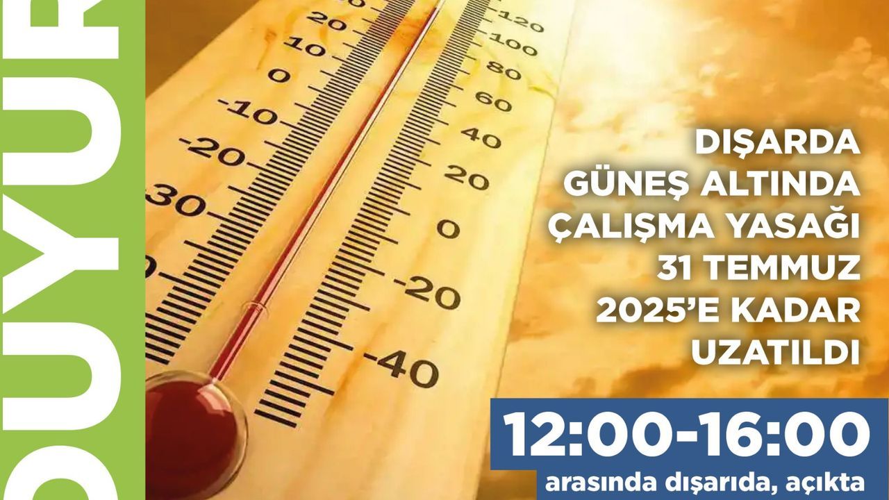 Bakanlıktan yapılan açıklamaya göre, bakanlık, KKTC Meteoroloji Dairesi’nin hava sıcaklığına ilişkin yaptığı değerlendirmeler ve İş Sağlığı ve Güvenliği önlemleri çerçevesinde, açık alanda yüksek sıcaklık altında çalışmanın oluşturduğu sağlık riski nedeniyle, 28 Temmuz - 31 Temmuz tarihleri arasında geçerli olmak üzere, dışarda güneş altında çalışmayı saat 12.00 ile 16.00 arasında yasaklama kararı aldı.