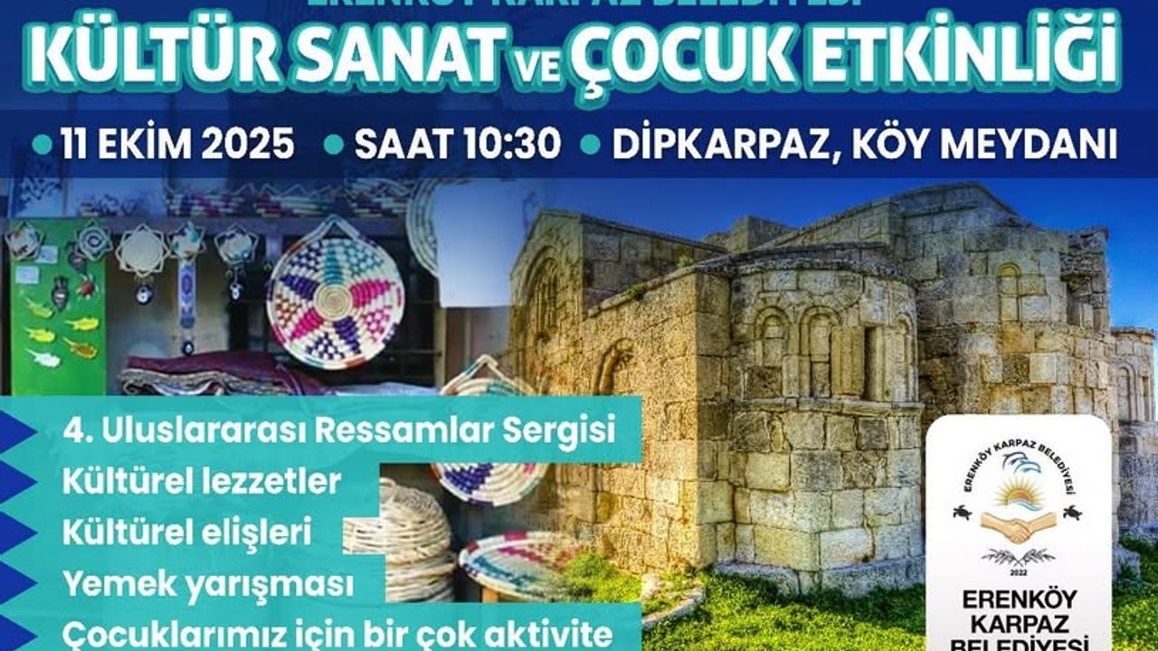 Erenköy-Karpaz Belediyesi'nin organizasyonuyla düzenlenen 'Kültür-Sanat ve Çocuk Etkinliği' cumartesi günü Dipkarpaz Köy Meydanı'nda yapılacak.