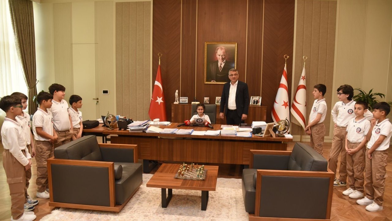 Cumhurbaşkanı Erhürman, 23 Nisan Ulusal Egemenlik ve Çocuk Bayramı kutlamaları nedeniyle Şehit Yalçın İlkokulu öğrencilerini kabul etti. Kabulde, Okul Müdürü Gönül Özal ve Öğretmen Ayşe Yücel de yer aldı.
