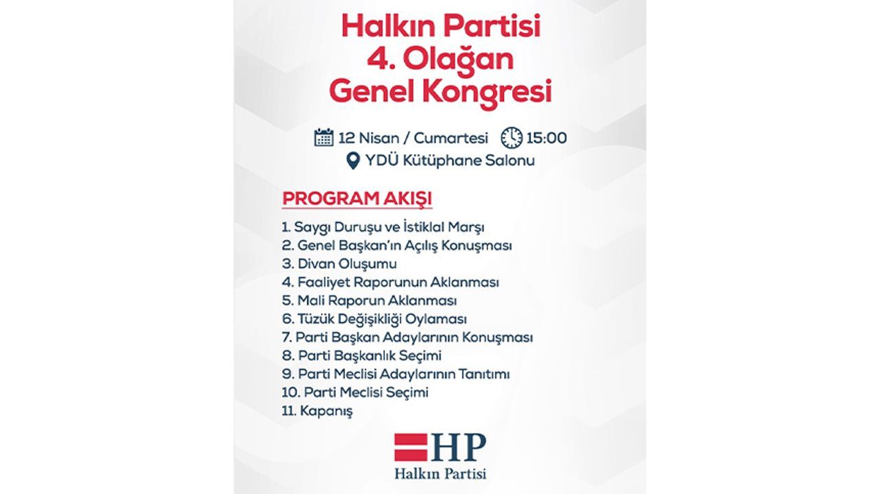 Halkın Partisi (HP) 4’üncü Olağan Genel Kongresi yarın yapılıyor. Halkın Partisi’nden yapılan açıklamaya göre, genel kongre saat 15.00’te Yakın Doğu Üniversitesi Kütüphane Salonu’nda yapılacak. Kongrede, genel başkan ve yeni parti meclisi seçilecek. Bunun yanında parti tüzüğünde bir takım değişikliklere gidilecek.