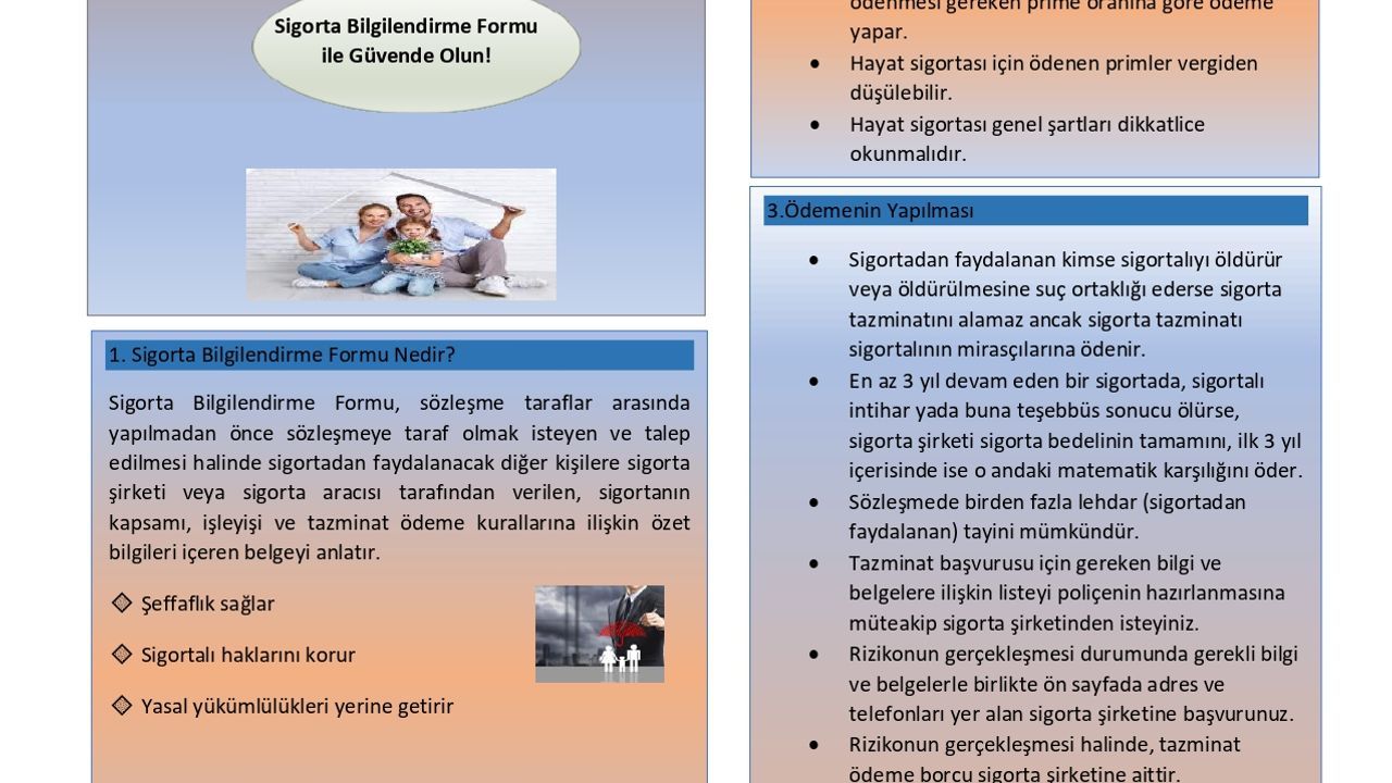 Hayat Dışı Sigortası ve Hayat Sigortası Bilgilendirme Formları’na yönelik tanıtım broşürü; “Sigorta Bilgilendirme Formu Nedir?, Genel Bilgi/Uyarılar, Rizikonun Gerçekleşmesi, Tazminler, Tazminat Ödemesi, Şikayet ve Bilgi Talepleri” gibi başlıkları ve özet bilgileri içeriyor.