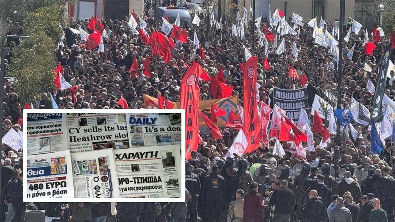 KKTC'de, hayat pahalılığıyla ilgili yasa tasarısını protesto etmek amacıyla dün yapılan grev ve eylem, bugünkü Rum gazetelerine de yansıdı.