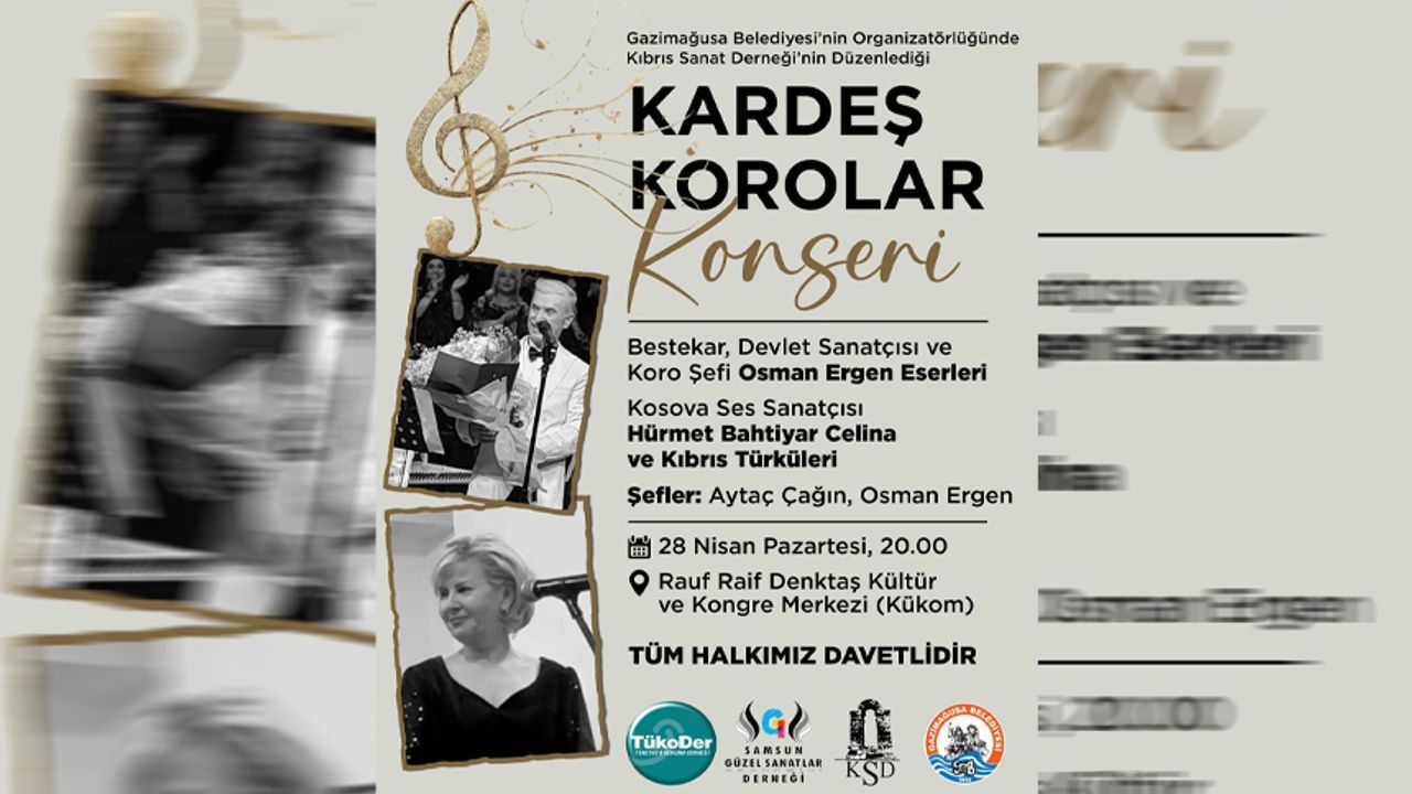 Kıbrıs Sanat Derneği, Gazimağusa Belediyesi'nin organizatörlüğünde, Kardeş Korolar konsepti çerçevesinde, Samsun Güzel Sanatlar Derneği ile Sinop Tüketiciler Derneği koroları olarak 28 Nisan Pazartesi saat 20.00'de Rauf Raif Denktaş kültür ve Kongre Merkezi'nde hayatta olan bestekarlardan, Devlet Sanatçısı, koro şefi ve bestekar Osman Ergen'in besteleri ile Kıbrıs Türkülerinden oluşan bir konser verecek.