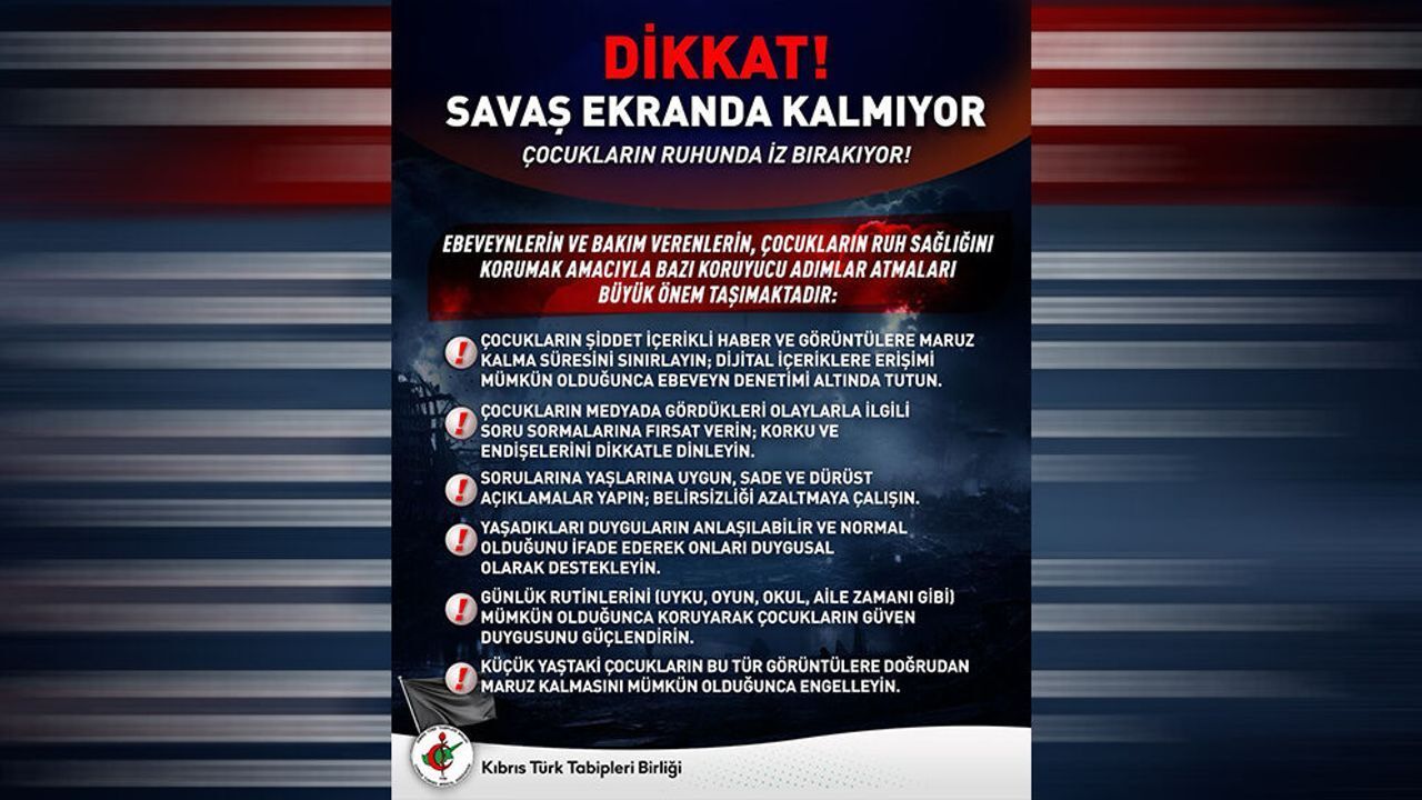 Kıbrıs Türk Tabipleri Birliği (KTTB), son günlerde medyada yer alan savaş ve şiddet görüntülerinin özellikle çocuklar üzerinde ciddi psikolojik etkiler yaratabileceği uyarısında bulundu.