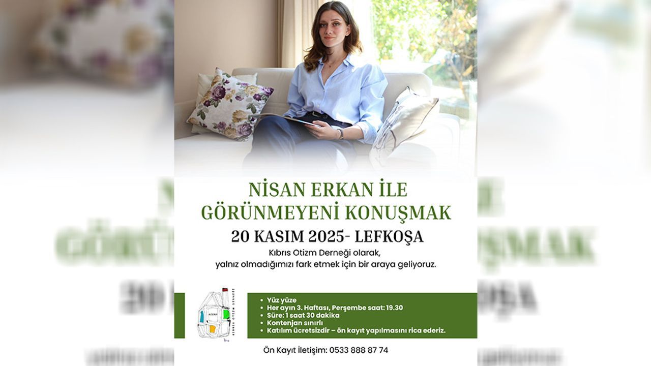 Dernekten yapılan açıklamaya göre, 'Nisan Erkan ile Görünmeyeni Konuşmak' başlıklı buluşmaların üçüncüsü saat 19.30'da Lefkoşa'da yapılacak. Her ayın 3. Perşembe günü düzenlenen etkinliğe katılım için ön kayıt ve iletişim 0533 888 87 74 numaralı telefondan sağlanıyor.