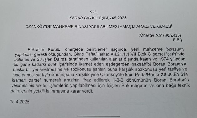 'İlgili Bakanlar Kurulu kararının başlığı 'Ozanköy`de mahkeme binası yapılabilmesi amaçlı arazi verilmesi' olsa da, kararın içeriği okunduğunda arazi tahsisinin, mahkemeye değil özel bir şahsa yapıldığı anlaşılmaktadır.