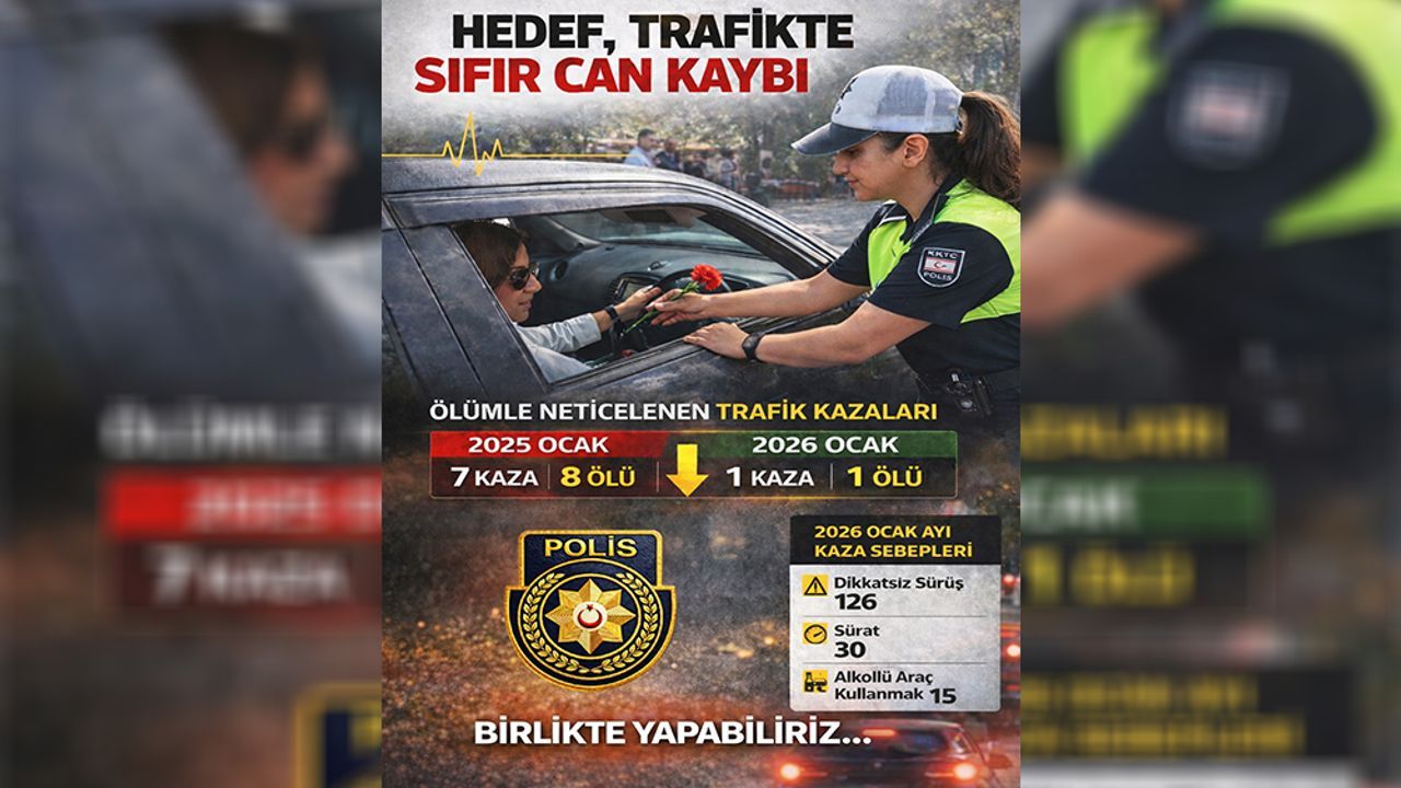 'Trafik Kurallarına Uyarak Sen De Güvenli Trafiğe Katkı Yap' ve 'Birlikte Yapabiliriz' sloganıyla PGM'den yapılan açıklamada, trafikte güvenlik seviyesini artırmak amacıyla Polis Genel Müdürlüğü tarafından hayata geçirilen 'toplum destekli polislik uygulamaları ve farkındalık çalışmaları' sonucunda, 2026 yılının Ocak ayında meydana gelen ölümlü trafik kaza sayısı ile yaşanan can kayıplarında, önceki yıla kıyasla belirgin bir düşüş sağlandığının görüldüğü kaydedildi.
