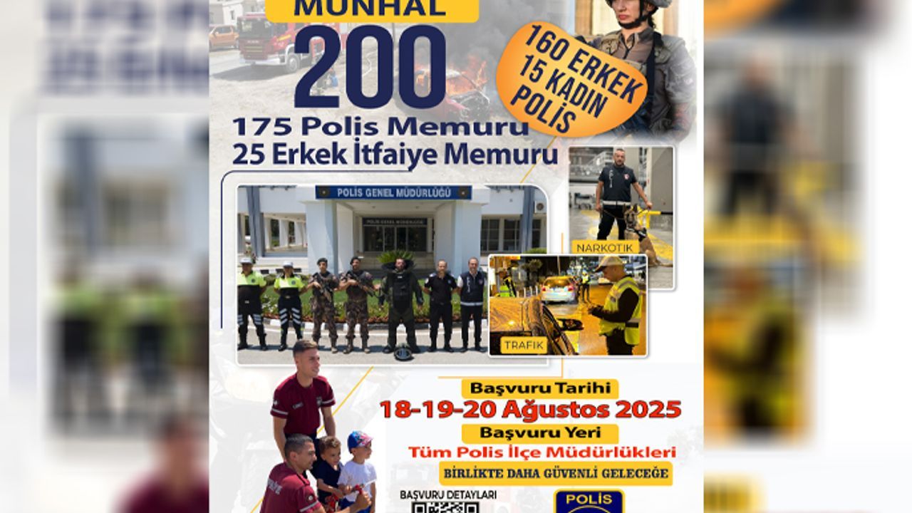 Polis Genel Müdürlüğünden verilen bilgiye göre, 160 erkek ve 15 kadın polis memuru ile 25 erkek itfaiye memuru için başvurular 20 Ağustos Çarşamba gününe kadar mesai saatleri içerisinde yapılabilir.