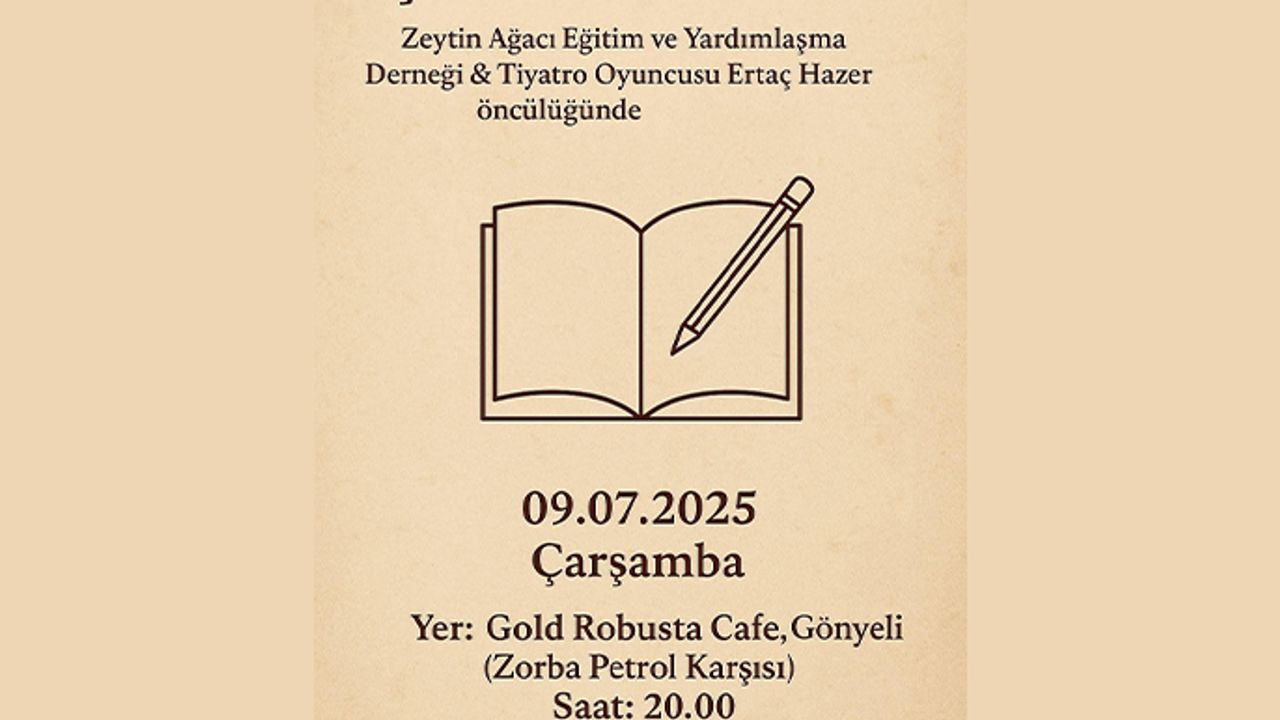 09 Temmuz Çarşamba günü Gönyeli’deki Gold Robusta Cafe’de saat 20.00’de düzenlenecek etkinlikte Ertaç Hazer, Gül Konuralp, Ali Üncü, Rabia Özcömert, Cihan Kombos şiirler seslendirecek. Etkinliğe katılanlar da şiirlerini okuyabilecek.