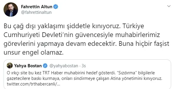 İletişim Başkanı Fahrettin Altun, TRT muhabirinin ırkçı Yunan internet sitesi tarafından hedef haline getirilmesini kınayarak, "Türkiye Cumhuriyeti Devleti'nin güvencesiyle muhabirlerimiz görevlerini yapmaya devam edecektir. Buna hiçbir faşist unsur engel olamaz." ifadelerini kullandı.