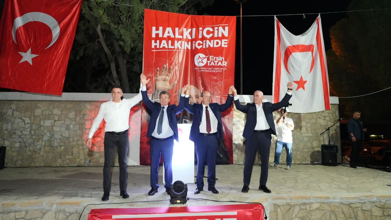 Tatar ayrıca, 'Karşı taraftakilerin meydanlarında ne Türkiye Cumhuriyeti bayrağı var, ne Kuzey Kıbrıs Türk Cumhuriyeti bayrağı var. Çünkü akılları karışık... Kime hizmet ettiklerini bilmeden siyaset yapanlar bu ülkede yok olmaya mahkûmdurlar. İnşallah bunları federasyon gibi 19 Ekim günü sandığa gömeceğiz.' ifadelerini kullandı.