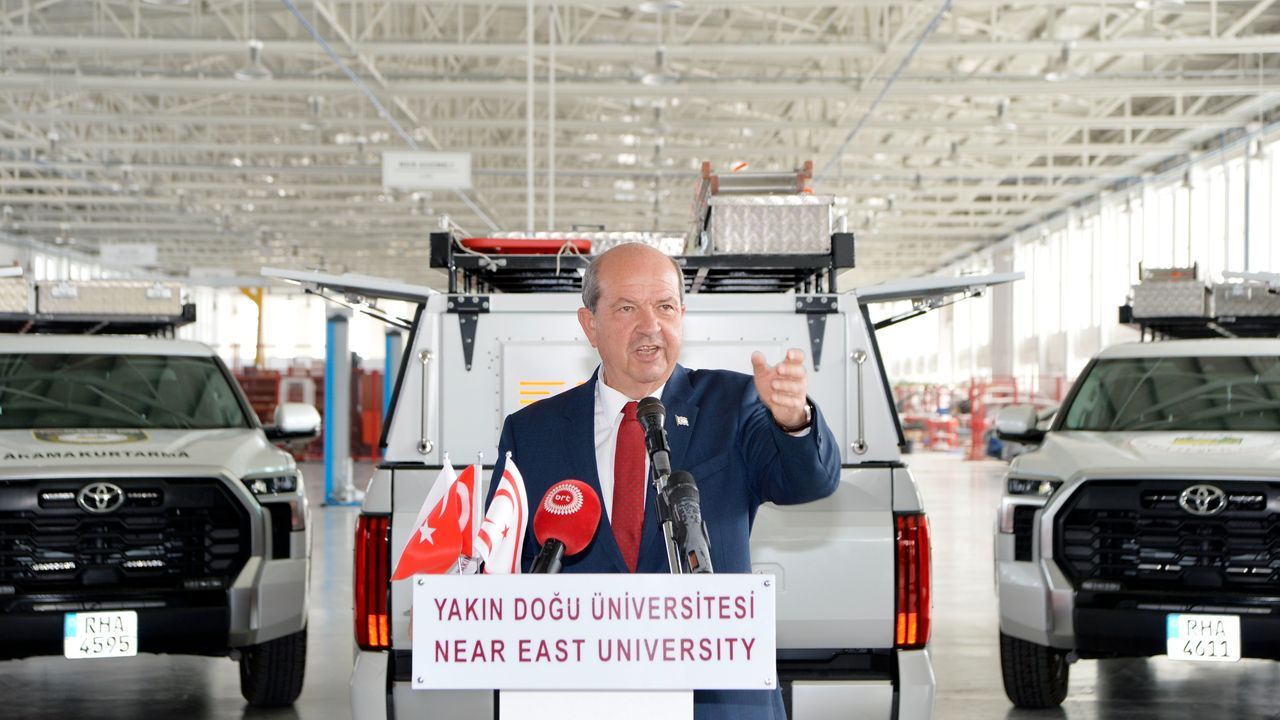 Cumhurbaşkanı Ersin Tatar, üst yapıları Günsel Mühendisliği'nin geliştirdiği Sivil Savunma Teşkilatı Başkanlığı’na ait 7 adet arama-kurtarma aracının teslim törenine katıldı.