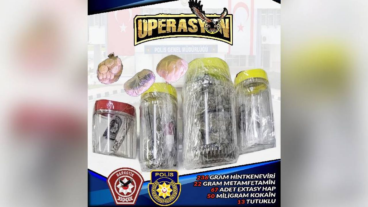 Narkotik ve Kaçakçılığı Önleme Müdürlüğü ile Polis Ekiplerince, Gazimağusa, Girne ve İskele ilçelerinde koordineli şekilde dün gerçekleştirilen 'Temiz Sokaklar Operasyonu' kapsamında yapılan ev, araç ve şahıs üst aramaları sonucunda; satışa hazır paketler halinde toplam 236 gram ağırlığında hintkeneviri türü, 22 gram ağırlığında metamfetamin türü ile 50 miligram ağırlığında kokain türü uyuşturucu madde, sentetik cannabinoid türü uyuşturucu madde içeren 10 adet kağıt, MDMA (extasy) türü uyuşturucu madde içeren toplam 67 adet hap, tütünle karışık uyuşturucu madde içeren 5 adet sarma sigara ile üzerlerinde uyuşturucu madde kalıntısı olan 3 adet hassas terazi, 2 adet öğütücü ve cam pipo ele geçirildi.