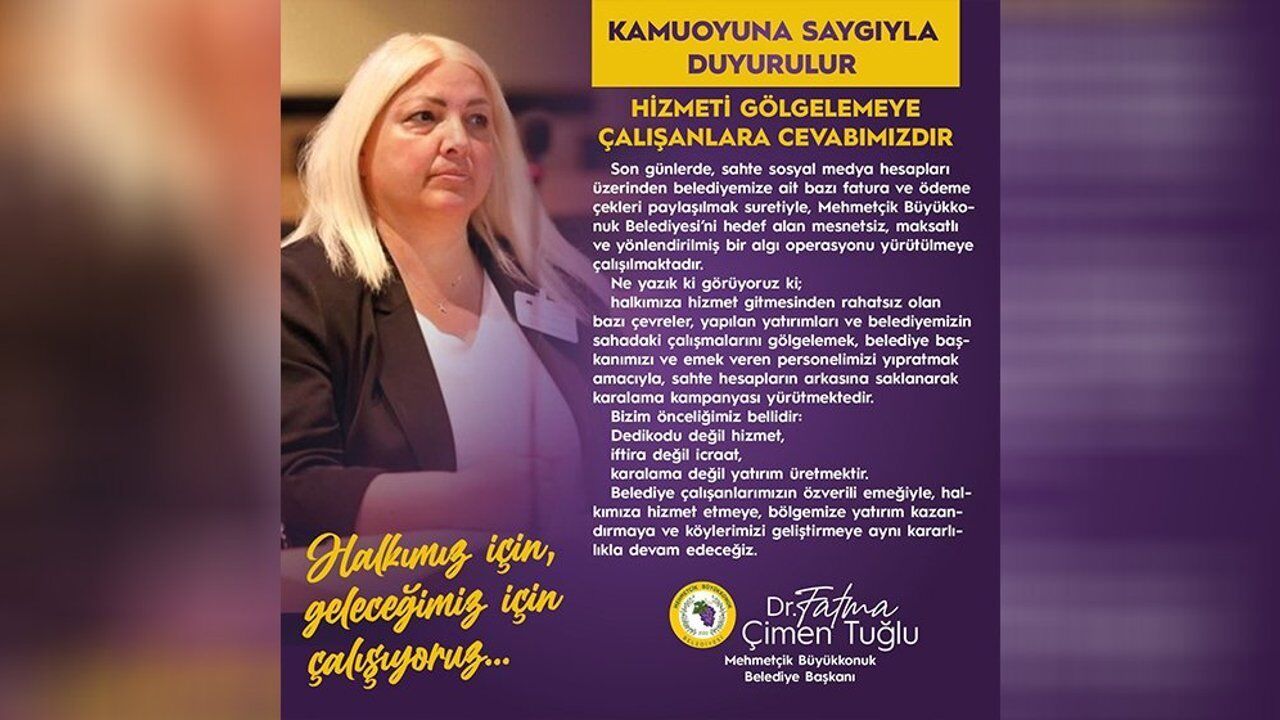 Mehmetçik Büyükkonuk Belediyesi Başkanı Dr. Fatma Çimen Tuğlu, son günlerde sosyal medyada gündeme gelen iddialara ilişkin yazılı bir açıklama yaptı. Belediye, sahte hesaplar üzerinden yürütüldüğü belirtilen paylaşımların 'mesnetsiz ve maksatlı bir algı operasyonu' olduğunu vurguladı.