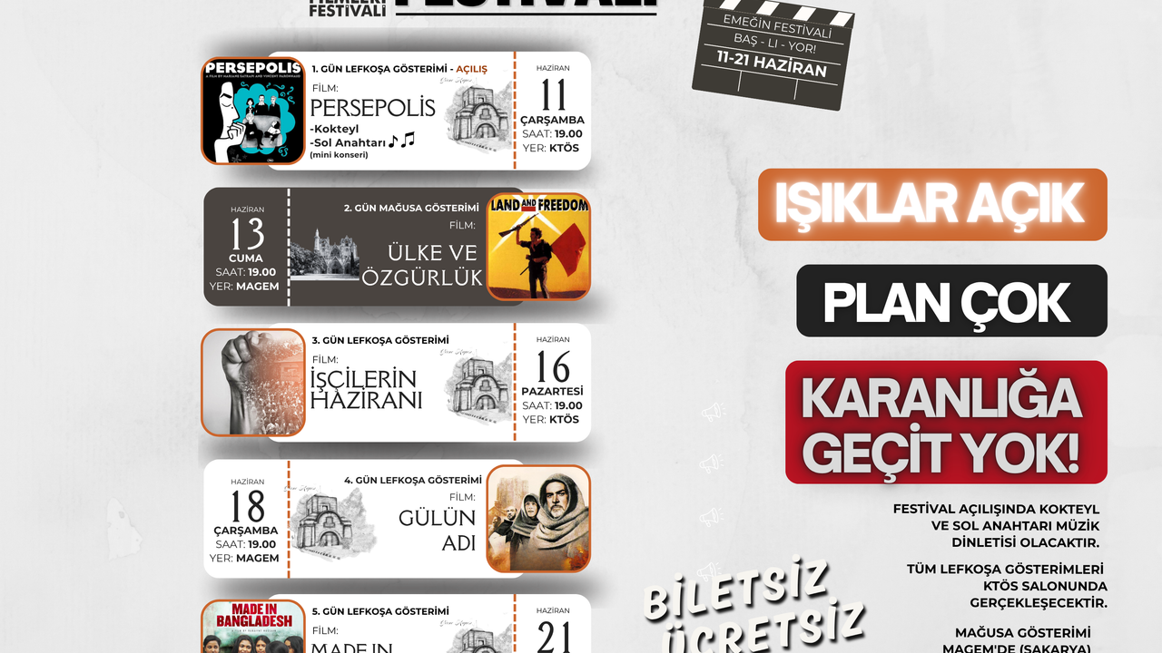 Açıklamada, Anonim Gençlik Örgütü, Baraka Kültür Merkezi, Basın-Sen, BES, El-Sen, Göç-Taş, Güç-Sen, Haksen, DAÜ Marksist Düşünce Topluluğu, Kadın Eğitimi Kolektifi, KOOP-SEN, KTAMS, KTOEÖS, KTÖS ve gönüllülerce hazırlanan festivalde tüm gösterimlerin ücretsiz ve biletsiz olacağı kaydedildi.