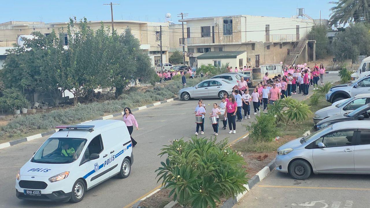 'Annemi Seviyorum', 'Farkında Ol', 'Erken Teşhis Hayat Kurtarır' ve 'Geç Kalma' yazılı pankartlarla yürüyen minik öğrenciler, hem köy halkına hem de ziyaret ettikleri Erenköy-Karpaz Belediyesi'ne farkındalık mesajı verdi.